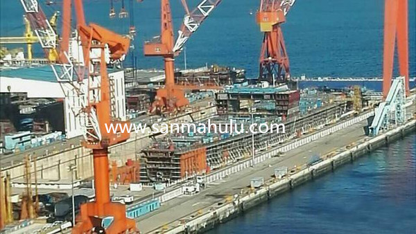 据了解,美国纽波特纽斯船厂干船坞上方安装了一台中国产巨型龙门吊,其更大的起吊能力为1050吨,沿船坞长度方向约轨道长度为743.7米,主梁跨度164.6米,主梁上有3个起重滑车,每个起重能力为300吨。这台龙门吊除了跨过船坞外,还跨过旁边的装配区,可以很方便地把装配区的分段吊入干船坞。在建造“布什”号航母时,该龙门吊起吊的更重的是飞行甲板中的一个分段,重865吨,中国国产航母的新分段重量已经超过美国航母的分段重量。