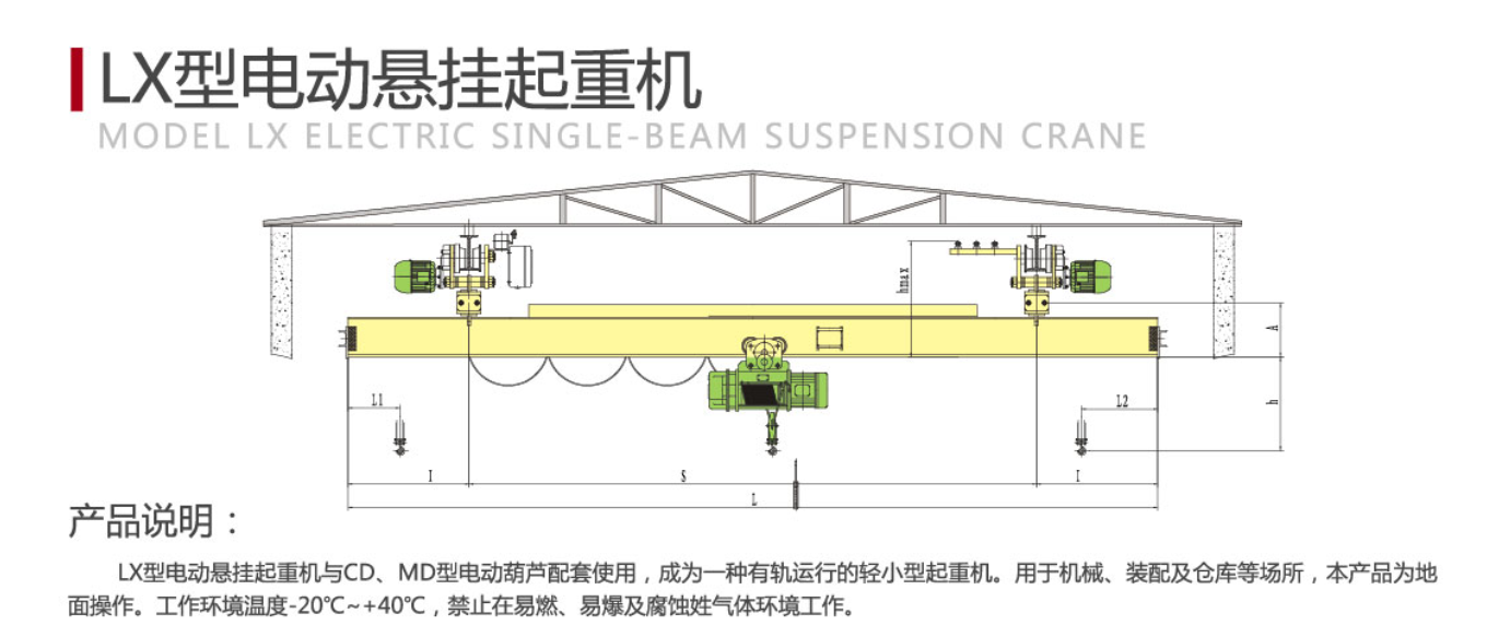 产品说明: LX型电动单梁悬挂起重机是一种与CD 1 ,MD 1 型草莓视频二维码配套使用的有轨运行的轻小型起重机。其适用起重量为0.5-5t,跨度为3-16m,起升高度6-30m,工作级别A 3 -A 4 ,工作环境温度为-20℃-+40℃范围内。本产品为一般用途起重机,多用于机械制造装配,仓库,车间等场所。