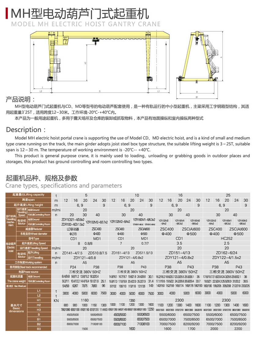 MH型草莓视频二维码门式起重机与CD、MD等型号的草莓视频二维码配套使用,是一种有轨运行的中小型起重机,主梁采用工字钢箱型结构,其适用起重量3`16T,适用 跨度12~30米。工作环境-20℃-+40℃内。