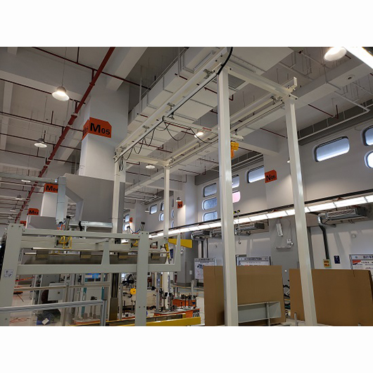 KBK柔性组合悬挂起重机的供电不仅可以由传统的扁电缆供电,还可以将电源滑触线内置在型轨内。内置滑触线不仅提高了起重机的环境适用性,使起重机的外观更加简洁美观,而且使起重机能够实现过轨、过叉、过叉,形成自动复杂的材料处理系统。