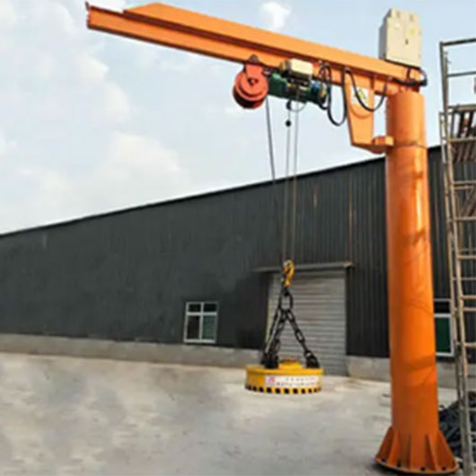 柱悬臂吊柱由圆管制成,底板和旋转轴焊接在两端,腰围轨道安装在上部。底板通过化学螺栓与混凝土地面连接固定,以确保悬臂起重机的稳定性。旋转轴上有一个通孔,以实现柱内电缆的隐藏穿线。360°集电器可安装在旋转轴上,使旋转臂旋转n×360°。腰围轨道用于悬臂起重机旋转,轨道上有多个通孔,用于安装旋转ji限块,角度限制为0-360°。